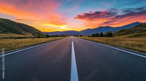 © Arty&Happy, Fototapeta premium A stunning highway landscape at sunset, capturing the endless road stretching into the horizon, surrounded by rolling hills and vibrant skies.