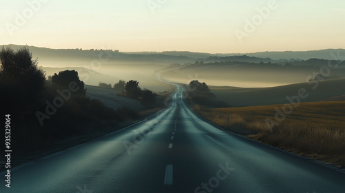 © Arty&Happy, Fototapeta premium A stunning highway landscape at sunset, capturing the endless road stretching into the horizon, surrounded by rolling hills and vibrant skies.