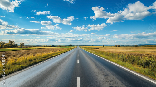 © Arty&Happy, Naklejka premium A stunning highway landscape at sunset, capturing the endless road stretching into the horizon, surrounded by rolling hills and vibrant skies.