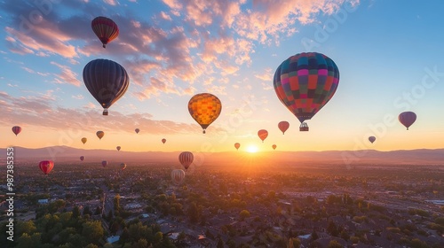 Naklejka premium A stunning hot air balloon festival with colorful balloons lifting off into the sunrise, filling the sky with vibrant colors