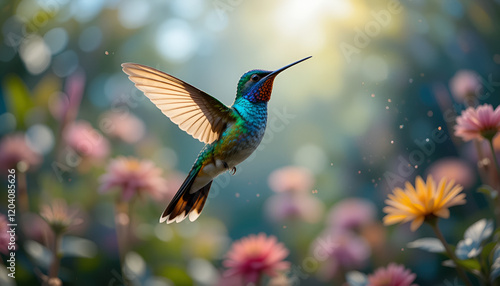 Obraz premium A stunning hummingbird hovers gracefully in a sunlit garden, displaying...