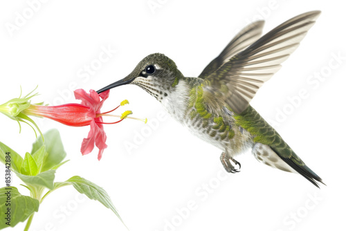© Rattanathip, Fototapeta premium A stunning hummingbird hovers in mid-air while feeding from a vibrant red flower in a beautiful, natural setting.