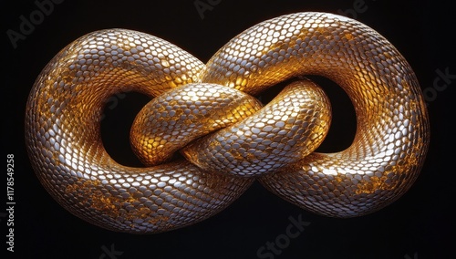 Fototapeta premium A Stunning Hyperrealistic 3D Representation of a Glossy Gold and Silver Infinite Knot Symbolizing Unity, Strength, and Continuity Against a Dark Background