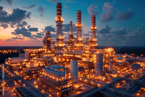 © JK_kyoto, Obraz premium A stunning industrial scene showcasing illuminated power plants against a twilight sky, highlighting energy production in motion.