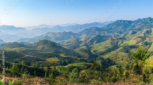 © lililia, Fototapeta premium a stunning landscape featuring lush green rice terraces against a backdrop of majestic mountains.