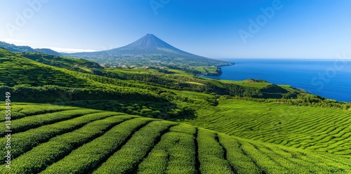 © Asayamrad, Obraz premium A stunning landscape featuring lush green tea fields with a backdrop of a prominent volcano and a clear blue ocean under a bright sky.
