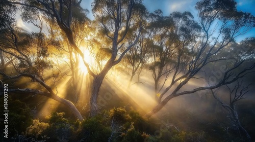 Fototapeta premium A stunning landscape featuring trees bathed in sunlight as rays penetrate through mist, creating an enchanting atmosphere.
