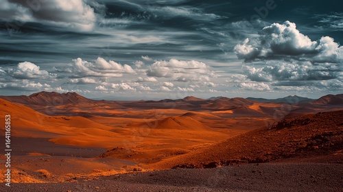© Hoolity, Fototapeta premium A stunning landscape featuring vast, arid terrain under dramatic clouds, showcasing shades of orange and brown, with distant mountains adding depth to the scene.