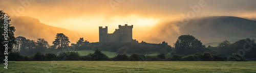 Fototapeta premium A stunning landscape showcasing an ancient castle silhouetted against a...