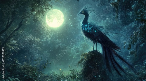 Naklejka premium A stunning, magical bird with radiant, long feathers and an elegant stance, perched in an enchanted forest under a glowing moon