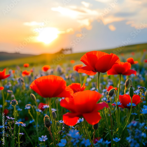 © Vera, Naklejka premium A stunning meadow full of vibrant red poppies and delicate blue wildflowers is bathed in the warm glow of sunset
