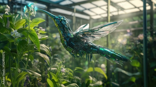 Fototapeta premium A stunning metallic hummingbird, blending technology with nature, hovers near a flower in a vibrant greenhouse.