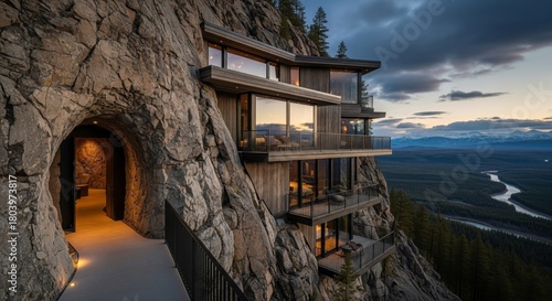 Naklejka premium A stunning modern home built into a cliffside with panoramic views.