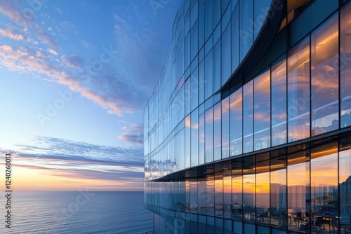 Naklejka premium A stunning modern skyscraper reflecting the sunset over the sea, showcasing...