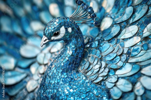 Fototapeta premium A stunning mosaic peacock, crafted from vibrant blue and white tiles, showcases intricate detail and artistry.