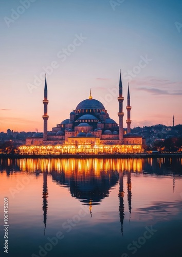 Naklejka premium A stunning mosque reflected in water during sunset, showcasing beautiful...
