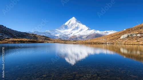 Fototapeta premium A stunning mountain landscape reflected in a serene lake, featuring clear blue skies and a snow-capped peak, surrounded by rocky terrain.