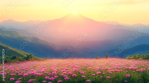 © Latevanila, Fototapeta premium A stunning mountain sunset overlooking a field of pink flowers