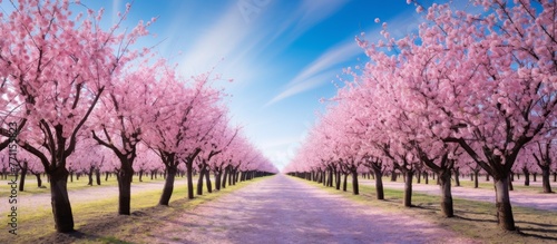 Obraz premium A stunning natural landscape with a row of cherry blossom trees along a road,...