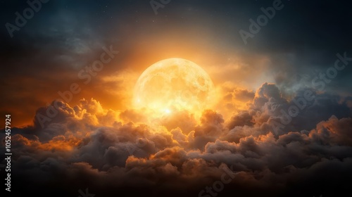 © JoxyAimages, Naklejka premium A stunning night display spotlighting a full moon with intricate detail against an expansive cloud backdrop, perfect for cosmic allure and artistic inspirations.