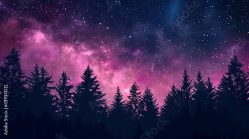 Fototapeta premium A stunning night sky filled with twinkling stars and vibrant nebulas, casting a breathtaking glow over a serene forest silhouette.