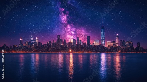 © Astri, Fototapeta premium A stunning night skyline of a city under a vibrant Milky Way backdrop.