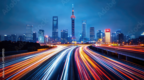 Fototapeta premium A stunning night view of a city skyline with vibrant light trails on a...