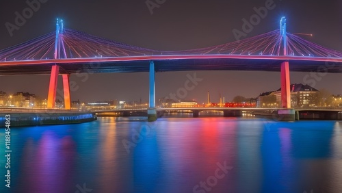 © Khan, Fototapeta premium A stunning night view of the illuminated Willemsbrug Bridge in Rotterdam, Netherlands, with beautiful long exposure light trails creating a mesmerizing effect.