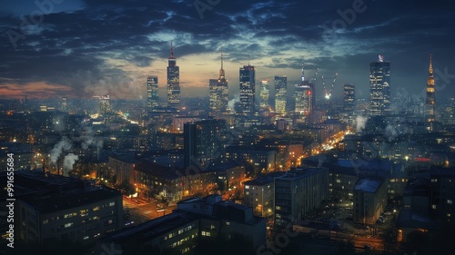 Fototapeta premium A stunning nighttime cityscape featuring illuminated skyscrapers and bustling city lights under a twilight sky.