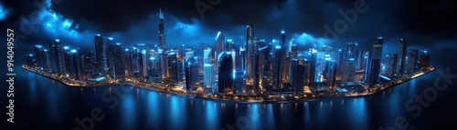 © pimnada, Fototapeta premium A stunning nighttime cityscape with vibrant lights reflecting on the water