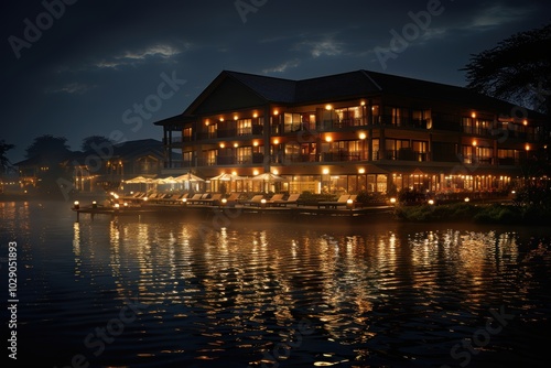 © aicandy, Naklejka premium A stunning nighttime view captures the enchanting allure of a beautifully illuminated lakeside hotel, reflecting shimmering lights on calm waters during a tranquil evening