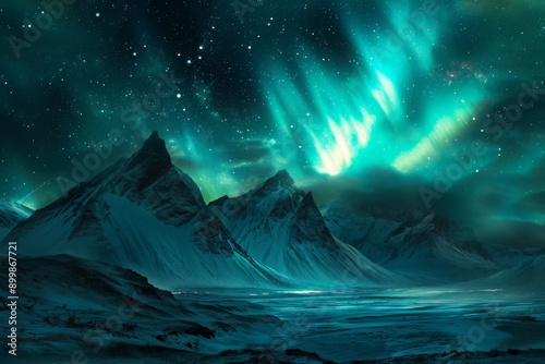 © Ifti Digital, Naklejka premium A stunning painting capturing the magnificence of a mountain landscape as it meets a sky illuminated by the ethereal display of aurora lights, Mountain ranges under the Northern Lights, AI Generated