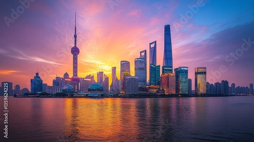 © THUA, Obraz premium A stunning panorama of the capital city, its iconic skyline glowing with modern skyscrapers and neon signs, the heart of commerce and technology pulsing with activity, set under a radiant sunset sky.