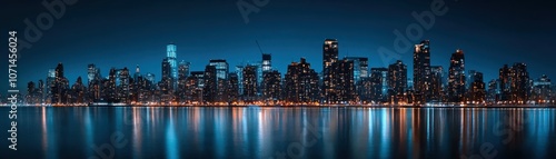 Fototapeta premium A stunning panoramic view of a vibrant city skyline illuminated at night, reflecting beautifully on the water.