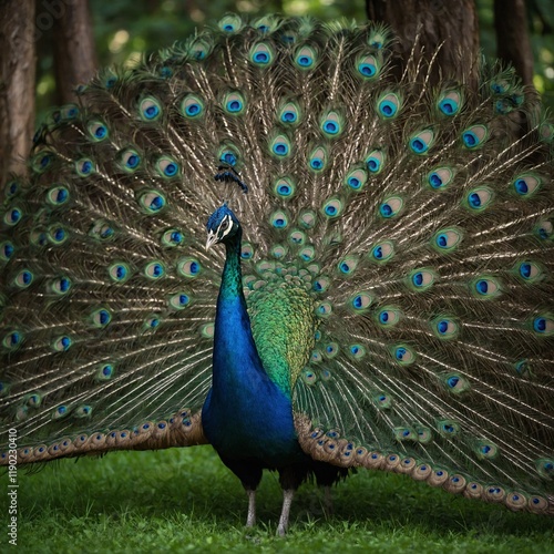 © Ejaz, Naklejka premium "A stunning peacock displaying its full spectrum of iridescent feathers in a lush, green forest clearing."