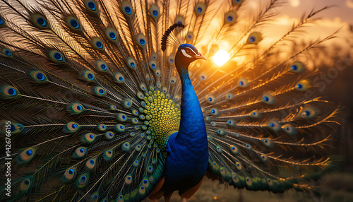 © Muhammad, Obraz premium "A stunning peacock displaying its vibrant feathers under the soft glow of sunset."
