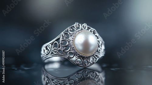 Naklejka premium A stunning pearl ring set in silver, with intricate detailing surrounding the central pearl, resting on a reflective surface to enhance its elegance.