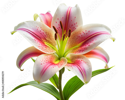 © Iaroslav, Naklejka premium A stunning pink and white lily with speckled petals, a green center, and prominent stamens, accentuated by fresh green leaves. transparent background