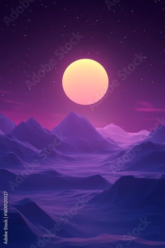 Fototapeta premium A stunning portrayal of a surreal landscape featuring a large sun casting its glow on majestic purple mountains. An enchanting visual experience.