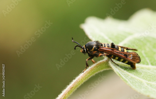 Fototapeta premium A stunning Rare Raspberry Clearwing Moth (Pennisetia hylaeiformis) perched on...