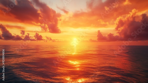 Fototapeta premium A stunning red sunset over calm ocean waters with vibrant clouds.