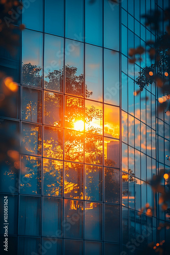 © Butsarakham, Naklejka premium A stunning reflection of a sunset in a glass building, surrounded by trees, showcasing vibrant colors and urban beauty.