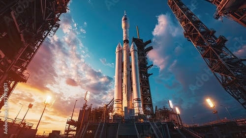 © Kitta Studio, Obraz premium A stunning rocket launch at sunset, showcasing the power of space exploration and human innovation against a vibrant sky.