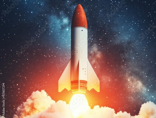 © kokoson6, Obraz premium A stunning rocket launches into space, surrounded by vibrant flames and a starry night, symbolizing exploration and innovation.