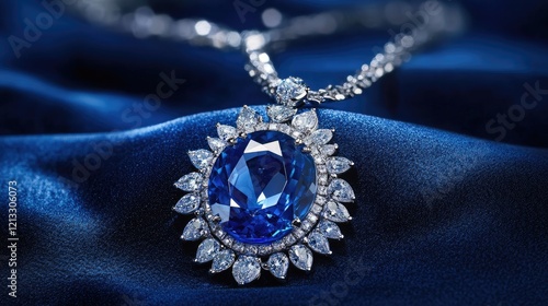 © Sampao, Fototapeta premium A stunning sapphire gemstone necklace displayed on a dark velvet surface with soft blue lighting.