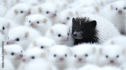 Fototapeta premium A stunning scene featuring a black hedgehog among a crowd of white hedgehogs...