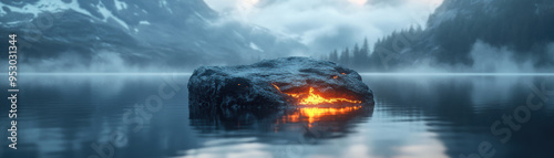 Naklejka premium A stunning scene of a fiery rock in a tranquil lake amidst misty mountains, capturing the contrast between fire and water, and the serenity of nature.