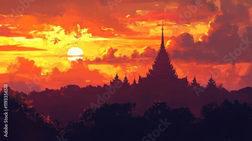 © Jonile, Obraz premium A stunning silhouette of a temple spire reaching toward a fiery sunset sky, capturing a sense of tranquility