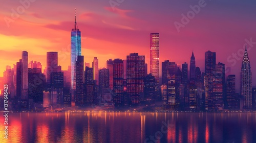© Embabu, Fototapeta premium a stunning skyline of a major city at sunset, with tall buildings silhouetted against a vibrant sky and reflecting on the water
