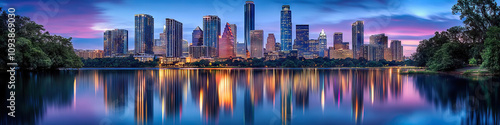 Fototapeta premium A stunning skyline of gleaming skyscrapers, reflecting on a tranquil lake below.